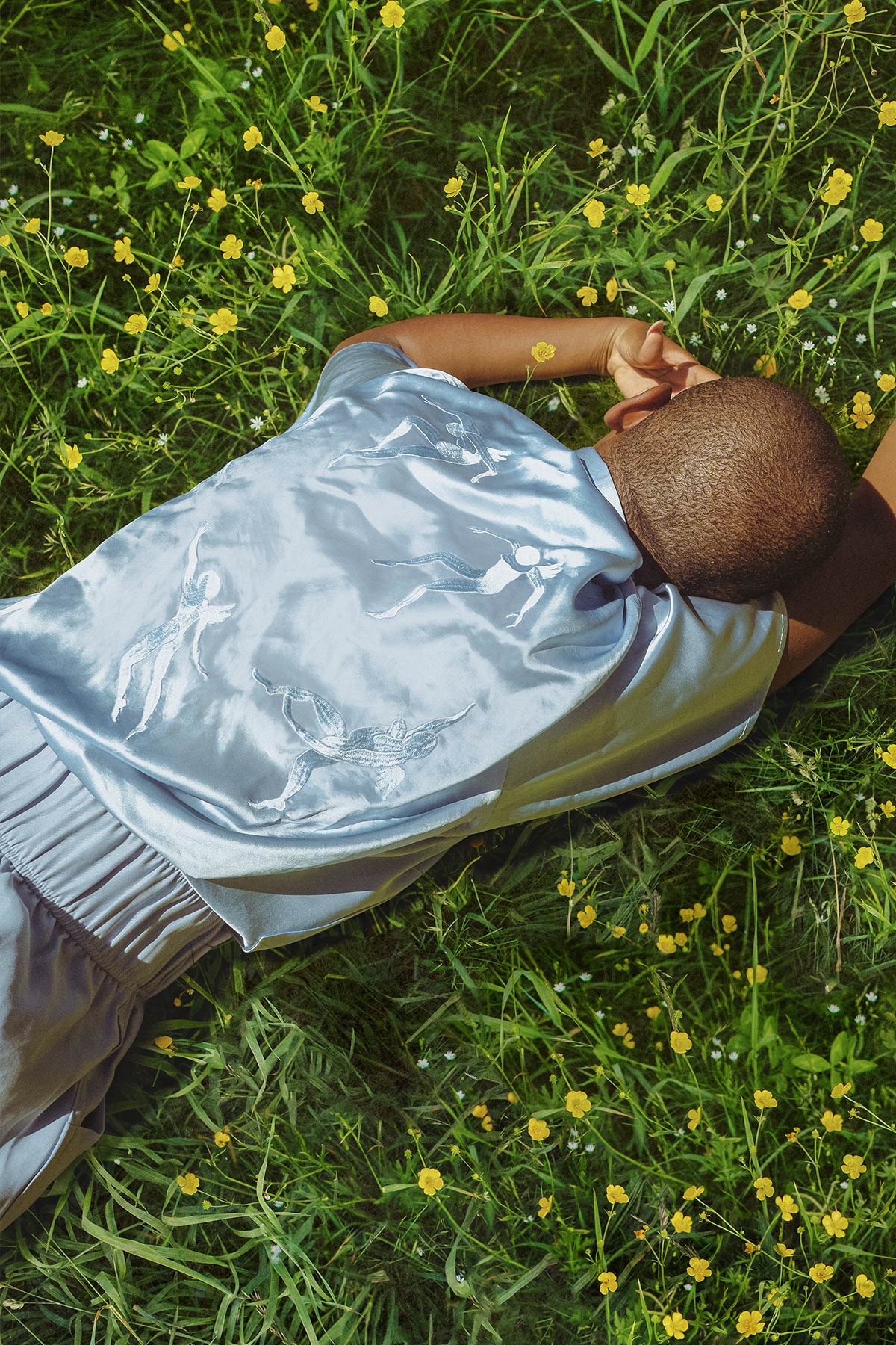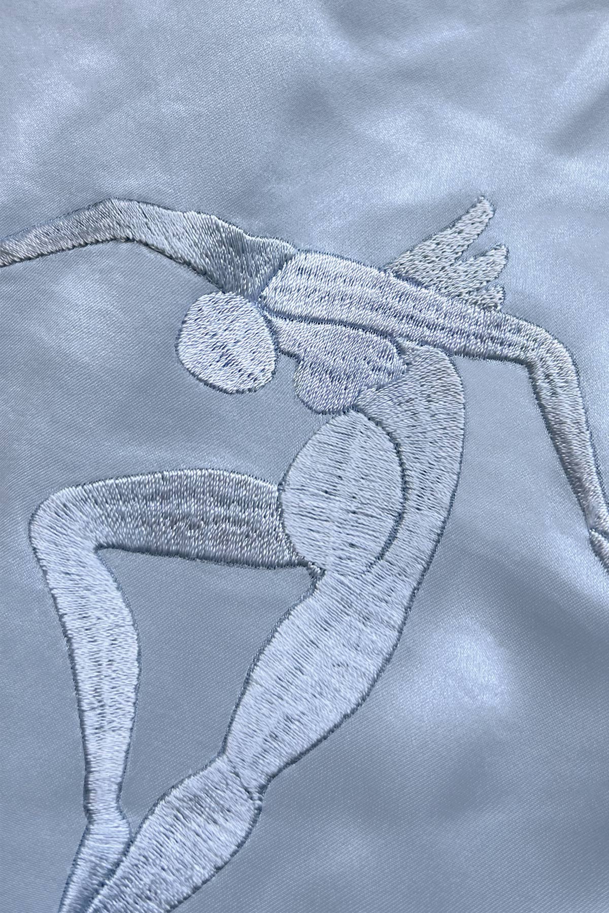 A soft silky blue shirt featuring five dancing angels inspired by Matisse. This lounge shirt has a pocket with a closure. This shirt is meant to be fitted oversized. 60% viscose, 40% silk. Machine wash and tumble dry delicate cycle, inside out. Model is 5’11”, size M wearing a size M.